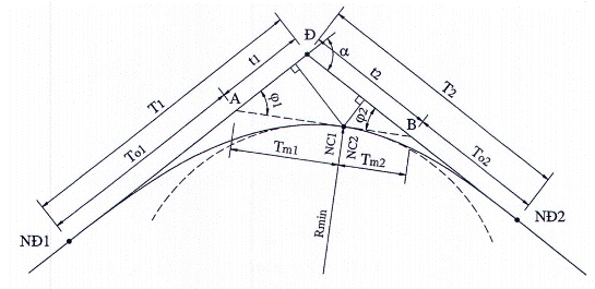 - Tính các tiếp tuyến T1=To1+ t1 và T2=To2+ t2 và xác định được các điểm NĐ1 và NĐ2 của hai đường cong chuyển tiếp