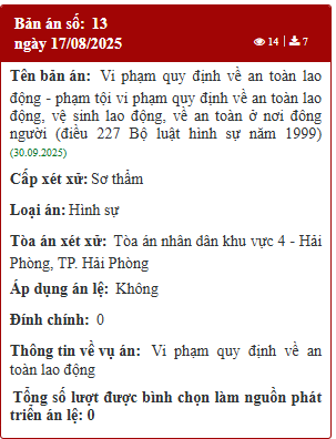 Hải Phòng: Bản án số 13 ngày 17/08/2025 của Tòa án nhân dân khu vực 4