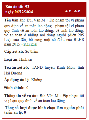 Hải Dương: Bản án số 92 ngày 06/12/2024 của TAND huyện Kinh Môn
