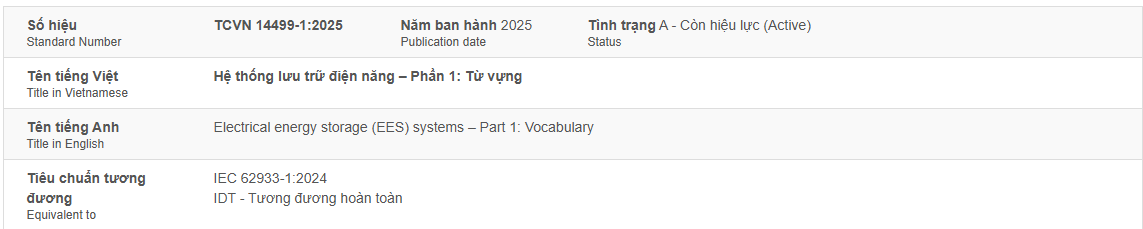 TCVN 14499-1:2025 (IEC 62933-1:2024): Hệ thống lưu trữ điện năng – Phần 1: Từ vựng (EN)