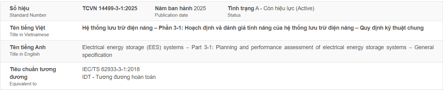 TCVN 14499-3-1:2025 (IEC/TS 62933-3-1:2018): Hệ thống lưu trữ điện năng – Phần 3-1: Hoạch định và đánh giá tính năng của hệ thống lưu trữ điện năng – Quy định kỹ thuật chung (EN)