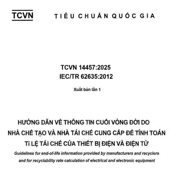 TCVN 14457:2025 (IEC/TR 62635:2012) về Hướng dẫn về thông tin cuối vòng đời do nhà chế tạo và nhà tái chế cung cấp để tính toán tỉ lệ tái chế của thiết bị điện và điện tử