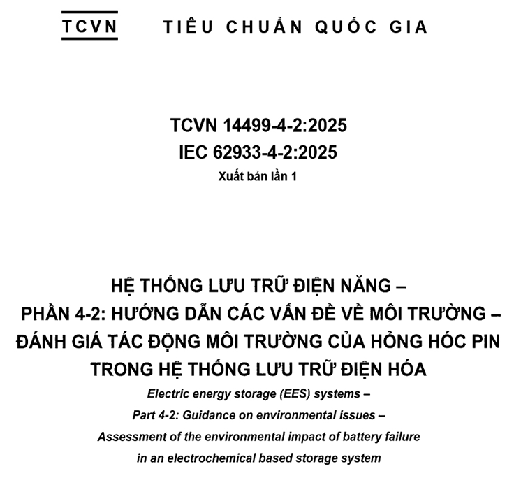 TCVN 14499-4-2:2025 (IEC 62933-4-2:2025) về Hệ thống lưu trữ điện năng - Phần 4-2: Hướng dẫn các vấn đề về môi trường - Đánh giá tác động môi trường của hỏng hóc pin trong hệ thống lưu trữ điện hóa