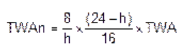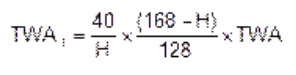 3.10. Giới hạn tiếp xúc ca làm việc (TWA - Time Weighted Average): Là giá trị nồng độ của một chất trong không khí môi trường lao động, tính trung bình theo thời lượng 8 giờ, mà không được phép để người lao động tiếp xúc vượt quá ngưỡng này trong ca làm việc 8 giờ/ca, 40 giờ/tuần.