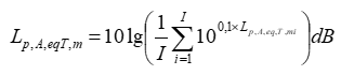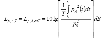 Mức áp suất âm theo thời gian trung bình trọng số A Lp,A,T là mười lần logarit cơ số 10 của bình phương mức áp suất âm theo trọng số A, pA, trong khoảng thời gian T (bắt đầu từ thời điểm t1 và kết thúc tại thời điểm t2), chia cho bình phương giá trị mức áp suất âm chuẩn, p0, tính theo dexiben.