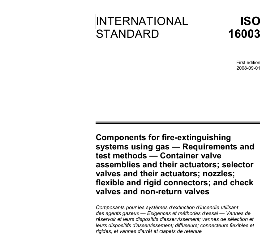 ISO 16003:2008 - Components for fire-extinguishing systems using gas - Requirements and test methods - Container valve assemblies and their actuators; selector valves and their actuators; nozzles; flexible and rigid connectors; and check valves and non-return valves (*)