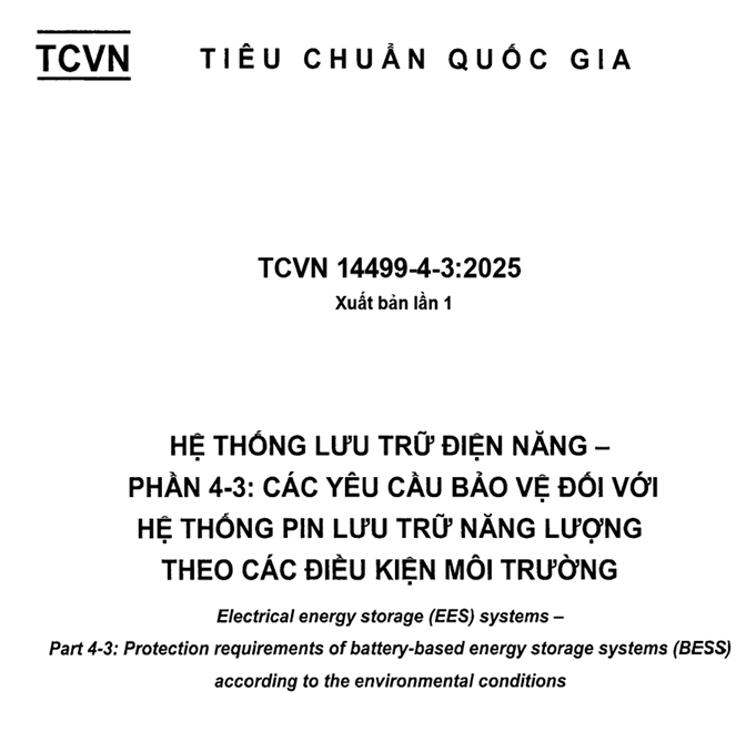 TCVN 14499-4-3:2025 về Hệ thống lưu trữ điện năng - Phần 4-3: Các yêu cầu bảo vệ đối với hệ thống pin lưu trữ năng lượng theo các điều kiện môi trường