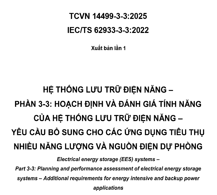 TCVN 14499-3-3:2025 (IEC/TS 62933-3-3:2022) về Hệ thống lưu trữ điện năng - Phần 3-3: Hoạch định và đánh giá tính năng của hệ thống lưu trữ điện năng - Yêu cầu bổ sung đối với các ứng dụng tiêu thụ nhiều năng lượng và nguồn điện dự phòng